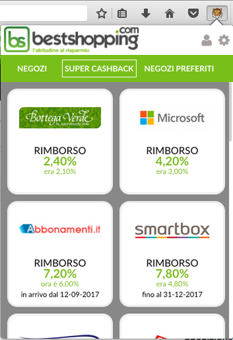 ส่วนขยายที่ต้องสมัครสมาชิกนี้ให้บริการเฉพาะผู้ใช้ที่ลงทะเบียนบน Bestshopping.com โดยมุ่งเน้นไปที่การซื้อจากร้านค้าในอิตาลี โดยการใช้เครื่องมือนี้ ผู้ใช้สามารถปรับปรุงวิถีชีวิตของตนได้โดยการตัดสินใจในการช็อปปิ้งที่มีข้อมูลซึ่งรวมถึงการประหยัดที่เป็นไปได้ ทำให้มันเป็นแหล่งข้อมูลที่จำเป็นสำหรับนักช็อปออนไลน์ที่ชาญฉลาดที่ต้องการใช้ประโยชน์จากข้อเสนอเงินคืน